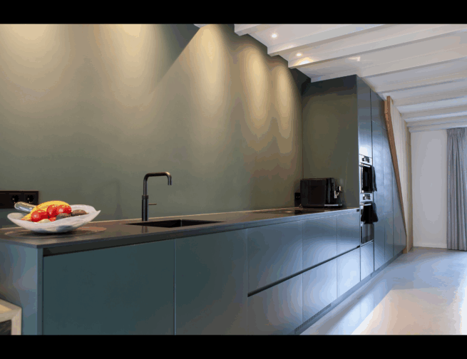 Zwevende maatwerk keuken met koffiehoek en hangende kast