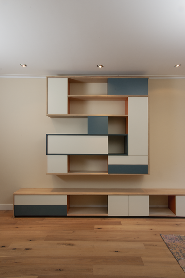 Door de lange horizontale onderzijde van de kast los te houden van het hoge gedeelte blijft het geheel ondanks haar afmeting luchtig. In het hangende hoge deel zijn de verschillende kastdelen als losse gekleurde blokken aan de muur bevestigd. Door meerdere eiken panelen verticaal en horizontaal te verbinden aan de blokken is er een samenhang ontstaan die ondanks haar complexiteit de kast orde en rust geeft.