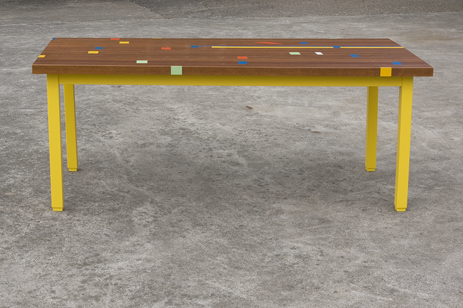 Dit is de derde tafel gemaakt van oude ‘gymvloer’ planken. De duidelijke lijn in blauw en geel geeft de tafel het meest zijn ‘gymvloer’ uiterlijk. Ieder meubel van deze vloerdelen probeer ik een eigen karakter te geven. Het gele onderstel maakt de tafel nog meer uitgesproken.