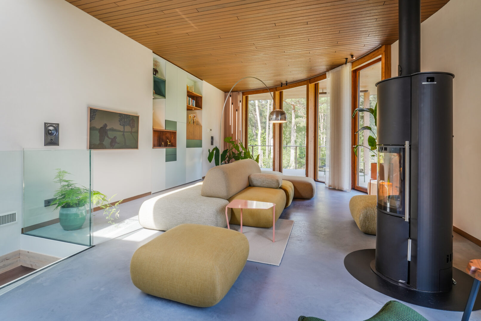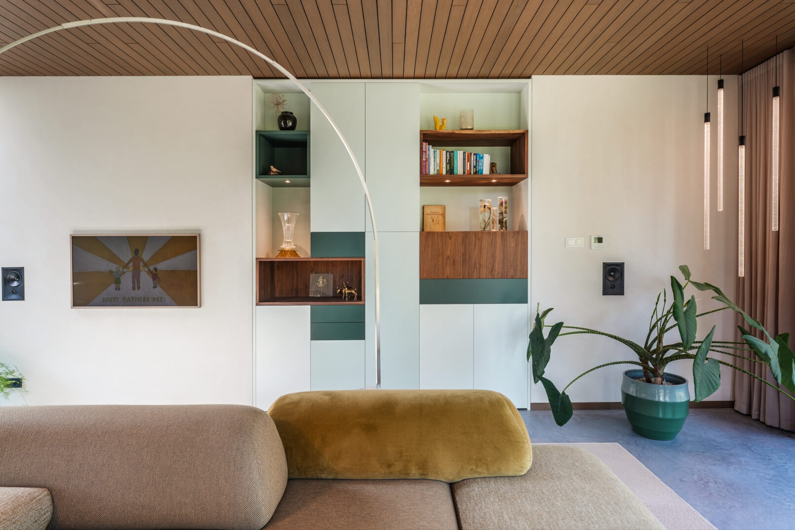 Voor de villa in het bos, waarvoor ik de keuken heb mogen ontwerpen en bouwen, heb ik in het woonkamer gedeelte een kastenwand gemaakt. De kast is opgenomen in een nis in de lange wand en neemt daardoor ogenschijnlijk geen ruimte in. Zij bestaat uit verschillende volumes met verschillende functies die op elkaar geplaatst zijn. De kast laat zich lezen als een compositie van diverse vlakken, kleuren en materialen.